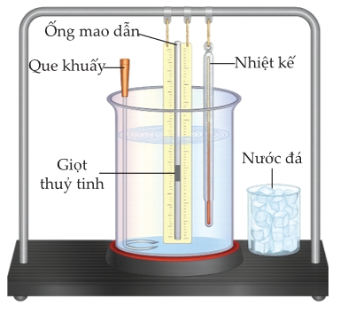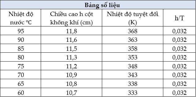 - Đổ nước đun sôi vào trong cốc thuỷ tinh ngập qua giọt thuỷ ngân. Chờ 1 – 2 phút học sinh bắt đầu đọc được nhiệt độ trên nhiệt kế lúc này là 95 °C và chiều cao cột không khí chứa trong ống là 11,8 cm.