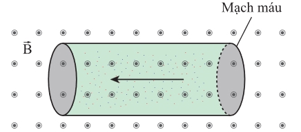 Câu 22 [1107301]: Trong y học, để chẩn đoán các bệnh lý về mạch máu như phát hiện tắc nghẽn hoặc hẹp động mạch, người ta sử dụng máy đo lưu lượng máu điện từ (Electromagnetic Blood Flowmeter). Cấu tạo của máy gồm hai thành phần chính: cuộn dây tạo ra từ trường đều vuông góc với dòng chảy của mạch máu; hai điện cực được gắn ở hai vị trí tiếp xúc với mô xung quanh mạch máu để đo hiệu điện thế cảm ứng.