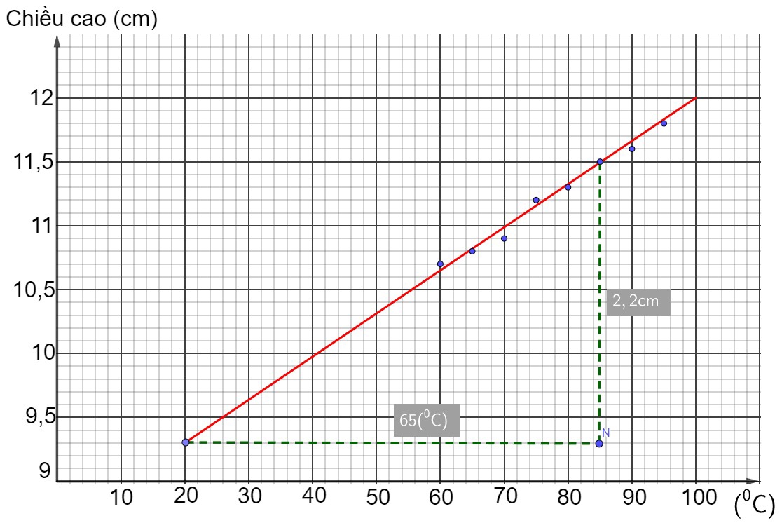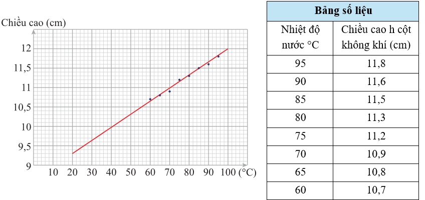 - Sau đó, lần lượt bỏ từng viên nước đá vào và khuấy đều cho nước đá tan, cứ khi nhiệt độ giảm đi 5 °C học sinh đọc chiều cao cột không khí. Dựa vào bảng số liệu học sinh vẽ được đồ thị sự phụ thuộc của chiều cao cột không khí vào nhiệt độ như hình.