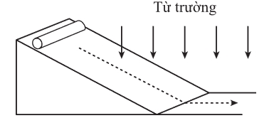 Câu 14 [1107299]: Trong một vùng từ trường đều hướng thẳng đứng xuống dưới, một thanh kim loại rơi thẳng đứng từ trạng thái nghỉ và chạm đất trên một mặt phẳng nghiêng. Thanh kim loại tiếp tục lăn xuống và ra khỏi mặt phẳng nghiêng như hình vẽ.
