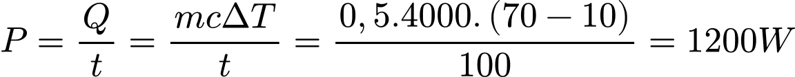 Câu 4 [708904]: Một dây may so nhiệt cung cấp năng lượng cho một chất lỏng có khối lượng 0,5 kg và nhiệt dung riêng 4000 J/(kg.K) chứa trong một bình có nhiệt dung không đáng kể. Giả sử rằng sự trao đổi nhiệt với môi trường xung quanh có thể được bỏ qua. Nếu nhiệt độ của chất lỏng tăng từ 10°C đến 70°C trong 100 giây, công suất dây may so nhiệt là