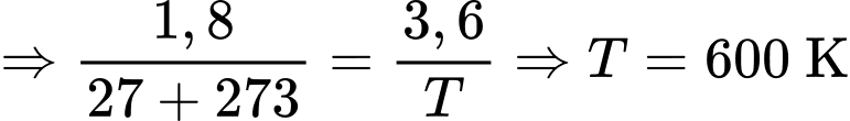 , thể tích 1,8 lít. Dãn nở đẳng áp lượng khí đến thể tích 3,6 lít thì nhiệt độ của khí là bao nhiêu (theo đơn vị Kelvin)? (kết quả làm tròn đến chữ số hàng đơn vị).