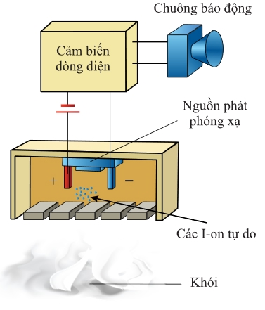 có chu kì bán rã T = 432,2 năm (lấy 1 năm bằng 365 ngày) được đặt giữa hai bản kim loại. Các hạt α phóng ra làm ion hoá không khí giữa hai bản kim loại, cho phép một dòng điện nhỏ chạy giữa hai bản kim loại đó và chuông báo động không kêu. Nếu có khói bay vào giữa hai bản kim loại, các ion trong này sẽ kết hợp với những phân tử khói và dịch chuyển chậm hơn làm cường độ dòng điện giữa hai bản kim loại giảm đi. Khi dòng điện giảm tới mức nhất định thì cảm biến báo khói sẽ gửi tín hiệu kích hoạt chuông báo cháy. Lấy
