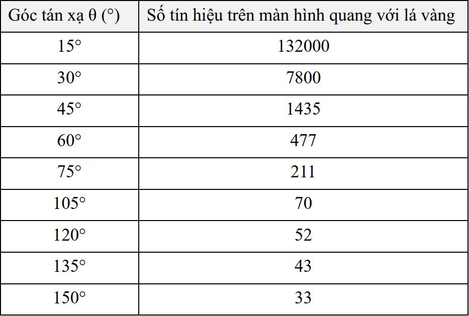 b) Đúng: Từ bảng số liệu ta thấy với góc tán xạ nhỏ thì số tín hiệu trên màn hình quang với lá vàng lớn. Từ khoảng góc