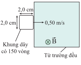 Câu 21 [1107316]: Một khung dây hình vuông có 150 vòng dây được đưa vào vùng không gian có từ trường đều với cảm ứng từ 0,30 T sao cho các đường sức từ vuông góc với mặt phẳng của khung dây (Hình vẽ). Biết mỗi cạnh của khung dây có độ dài 2,0 cm và khung dây được dịch chuyển với tốc độ không đổi bằng 0,50 m/s.