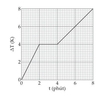 Câu 20 [1107353]: Đồ thị biểu diễn sự biến thiên độ thay đổi nhiệt độ ΔT theo thời gian t của 1 kg một chất, ban đầu ở thể rắn tại nhiệt độ phòng. Chất này được đun nóng với công suất đều là 1000 J/phút.