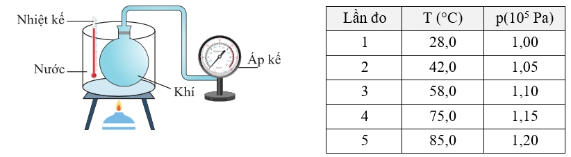 Câu 19 [1107352]: Một học sinh tiến hành thi nghiệm khảo sát sự phụ thuộc của áp suất theo nhiệt độ của một lượng khí xác định theo sơ đồ như hình vẽ. Trong đó, bình thủy tinh hình cầu có nút kín, bên trong có chứa 2 lít khí được nối thông với áp kế qua một ống nhỏ. Bình thủy tinh được nhúng trong một bình nước, nhiệt độ của nước được đo bởi một nhiệt kế. Coi rằng nhiệt độ khí trong bình luôn bằng nhiệt độ nước bên ngoài, bỏ qua sự dãn nở vì nhiệt của bình thủy tinh. Học sinh tiến hành đun nóng từ từ nước trong bình rồi ghi lại giá trị nhiệt độ t được chỉ bởi nhiệt kế và áp suất p được chỉ bởi áp kế, thu được kết quả ở bảng dưới đây.