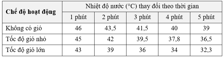 Câu 19 [707798]: Một nhóm học sinh làm thí nghiệm khảo sát khả năng làm nguội nước nhờ gió ở điều kiện nhiệt độ phòng 25 °C. Nhóm sử dụng 2 kg nước có nhiệt độ ban đầu là 50 °C. Dùng quạt thổi qua chậu nước ở các chế độ khác nhau và đo nhiệt độ của nước sau mỗi phút. Biết nhiệt dung riêng của nước là C = 4200 J/(kg.K). Kết quả đo được ghi vào bảng như sau: