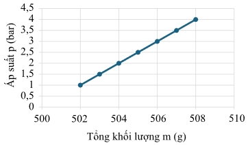 Câu 21 [1107362]: Một học sinh sử dụng một bình thép có thể tích không đổi, một cân điện tử và một áp kế để khảo sát sự phụ thuộc của áp suất vào lượng khí Oxygen nạp vào. Thí nghiệm được tiến hành ở nhiệt độ phòng không đổi là 25°C. Học sinh ghi lại tổng khối lượng bình và khí (mtổng) và áp suất (p) tương ứng, thu được đồ thị như hình bên.