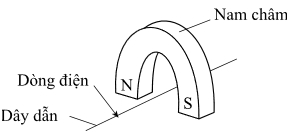 Câu 22 [1107417]: Một dây dẫn được đặt giữa các cực của một nam châm hình móng ngựa. Có một dòng điện chạy trong dây theo hướng như hình vẽ, và điều này gây ra một lực tác dụng lên dây.