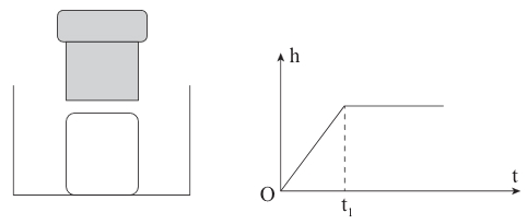 Câu 28 [1106225]: Đặt một viên nước đá đặc có khối lượng 160 g hình trụ có diện tích đáy là S1, ở nhiệt độ 0 °C vào trong một cái cốc hình trụ có tiết diện đáy là S2 = 3S1 như hình vẽ. Chiếu một đèn laze lên viên nước đá đảm bảo đèn chỉ chiếu vào mặt trên của nó để nước đá chỉ tan ở phần có laze chiếu vào. Quan sát mực nước trong cốc theo thời gian và vẽ đồ thị như hình bên. Bỏ qua sự trao đổi nhiệt của môi trường lên nước đá và nước trong cốc và sự thay đổi thế năng trọng trường của hệ. Biết nhiệt nóng chảy riêng của nước đá là 3,34.105 J/kg. Nhiệt lượng mà chùm laze cung cấp cho viên nước đá kể từ khi chiếu đến thời điểm t1 là bao nhiêu kJ (kết quả làm tròn đến chữ số hàng phần mười)