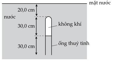 Câu 8 [1106219]: Một ống thẳng đứng, kín một đầu, được nhúng trong nước. Một cột không khí bị kẹt bên trong ống như hình vẽ. Khối lượng riêng của nước là 1000 kg/m3. Chênh lệch giữa áp suất không khí trong ống và áp suất khí quyển là bao nhiêu?