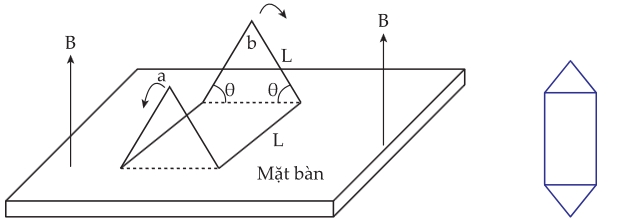 Câu 13 [1106221]: Sợi dây dẫn được hiển thị trong hình 1 được uốn thành hình dạng một chiếc lều, với góc θ = 60° và cạnh L = 1,5 m. Nó được đặt trong một từ trường có độ lớn 0,30 T hướng vuông góc với mặt bàn. Nếu chiếc lều được trải phẳng ra trên mặt bàn trong thời gian 0,10 s như hình 2 minh họa bên dưới (góc nhìn từ trên xuống), thì suất điện động cảm ứng trung bình xuất hiện trong dây dẫn trong khoảng thời gian này là bao nhiêu?