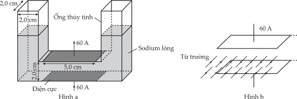Câu 19 [1106222]: Ống hình chữ U được hiển thị ở trên chứa sodium lỏng có khối lượng riêng là 960 kg/m3. Các điện cực được đặt vào mặt trên và mặt dưới của đoạn ống nằm ngang và một dòng điện 60 A được dẫn qua chất lỏng như trong hình a.