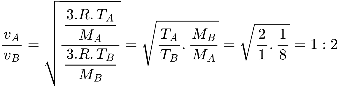 Câu 9 [1106220]: Hai bình giống hệt nhau chứa hai khí khác nhau A và B, được coi là khí lý tưởng. Nếu tỉ lệ khối lượng mol và nhiệt độ tuyệt đối của chúng lần lượt là 8:1 và 2:1, thì tỉ lệ tốc độ căn quân phương của chúng là bao nhiêu?