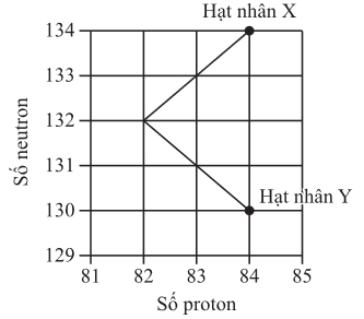 Câu 16 [1106236]: Đồ thị hình bên biểu diễn số neutron theo số proton thể hiện một chuỗi các phân rã phóng xạ. Hạt nhân X nằm ở vị trí bắt đầu của chuỗi và sau khi các phân rã xảy ra, hạt nhân Y được hình thành. Những gì được phát ra trong chuỗi phân rã này?