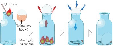 Câu 20 [1106239]: Một học sinh tiến thành làm thí nghiệm khảo sát định luật chất khí với các dụng cụ sau: Một bình thuỷ tinh trong suốt, bên trong có chứa một số mảnh giấy đã cắt nhỏ; Một que diêm mồi lửa và quả trứng luộc đã được bóc vỏ. Học sinh bỏ que diêm vào trong bình thuỷ tinh để đốt cháy các mảnh giấy nhỏ; sau đó đặt quả trứng lên miệng bình. Hiện tượng thí nghiệm xảy ra được mô tả như hình bên dưới.