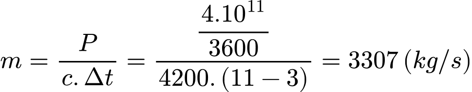 Câu 5 [1106232]: Để làm mát máy phát điện của một nhà máy điện hạt nhân, nước lạnh đi vào bộ trao đổi nhiệt của máy phát ở nhiệt độ 3 °C và đi ra ở nhiệt độ 11 °C. Tốc độ thu nhiệt của nước là 4,0.1011 J mỗi giờ. Nhiệt dung riêng của nước là 4200 J/kg.K. Khối lượng riêng của nước là 1000 kg/m3. Tốc độ dòng chảy (lưu lượng) của nước là bao nhiêu?