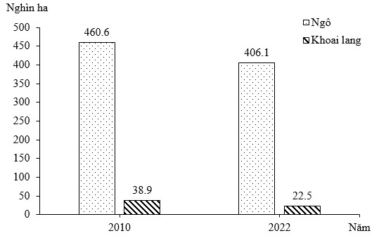 Căn cứ vào bảng số liệu trên, hãy cho biết diện tích ngô năm 2022 so với năm 2010 giảm nhanh hơn diện tích khoai lang của vùng Trung du và miền núi Bắc Bộ bao nhiêu lần? (làm tròn kết quả đến một chữ số thập phân).