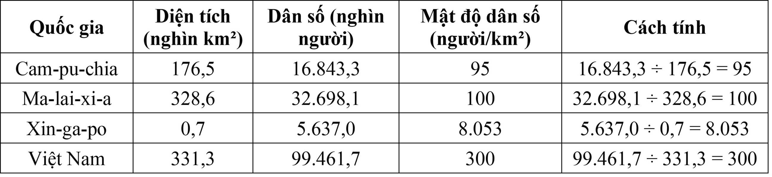 ✅ Chênh lệch mật độ cao nhất - thấp nhất: → 8.053 (Singapore) – 95 (Campuchia) = 7.958 người/km²