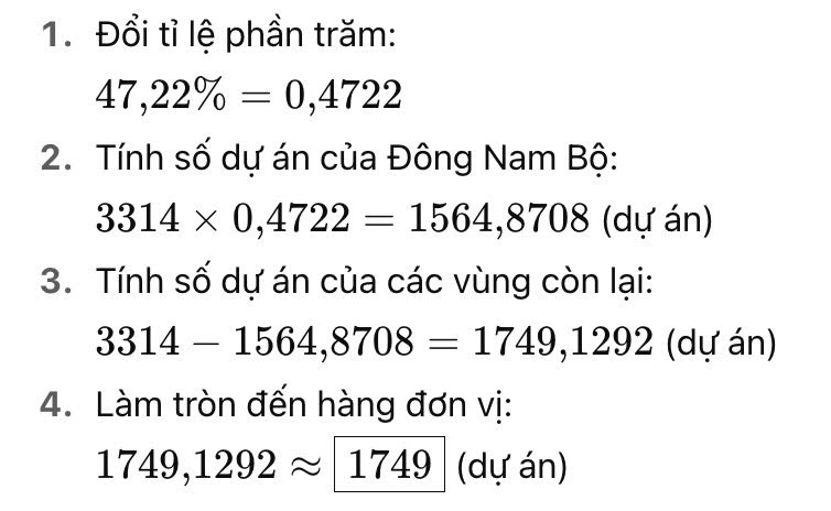 Câu 14 [782608]: Năm 2023, tổng số dự án đầu tư trực tiếp của nước ngoài được cấp giấy phép ở nước ta là 3314, vùng Đông Nam Bộ chiếm tỉ lệ 47,22% trong tổng số. Hãy cho biết số dự án đầu tư trực tiếp của nước ngoài được cấp giấy phép của các vùng còn lại năm 2023 là bao nhiêu (làm tròn kết quả đến hàng đơn vị)?