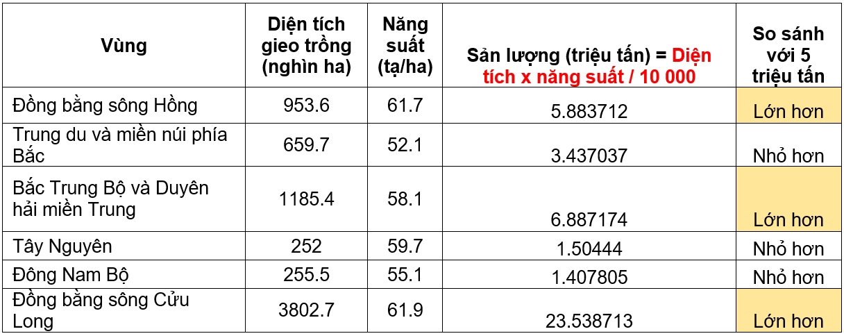 Căn cứ vào bảng số liệu trên, hãy cho biết bao nhiêu vùng có sản lượng lúa cả năm 2022 trên 5 triệu tấn?
