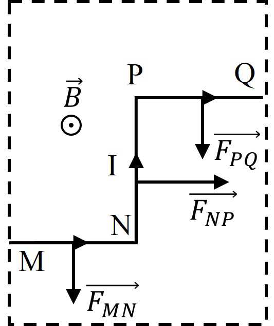 Câu 48 [820953]: Một đoạn dây dẫn được uốn vuông góc tại hai điểm N, P như hình vẽ. Dòng điện chạy trong dây có cường độ 2,0 A. Từ trường đều với cảm ứng từ có phương vuông góc với mặt phẳng chứa dây dẫn và có độ lớn