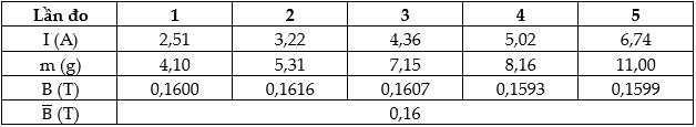 Câu 42 [820937]: Một nhóm học sinh thực hiện thí nghiệm xác định độ lớn cảm ứng từ. Bộ dụng cụ bao gồm: dây dẫn CD mang dòng điện không đổi (1), nam châm hình chữ U tạo từ trường đều (2), cân điện tử (3). Nhóm lắp đặt các dụng cụ như hình vẽ, dây CD được cố định theo phương ngang giữa hai cực của nam châm, dòng điện chạy qua đoạn dây có gắn ampe kế. Ban đầu nhóm ngắt công tắc điện k, điều chỉnh cân về số chỉ 0. Sau đó đóng công tắc k để có dòng điện chạy qua dây CD, đọc giá trị cường độ dòng điện và số chỉ của cân. Lặp lại thí nghiệm với 5 lần đo và ghi số liệu vào bảng. Lấy g = 9,80 m/s2. Chiều dài phần dây trong từ trường là 10 cm.