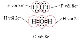 Trong các phân tử F2 và H2O, mỗi nguyên tử F, H và O đều đạt được cấu hình electron của khí hiếm ổn định bằng cách dùng chung các electron, quy tắc bát tử được minh họa như hình bên (trừ trường hợp của H).