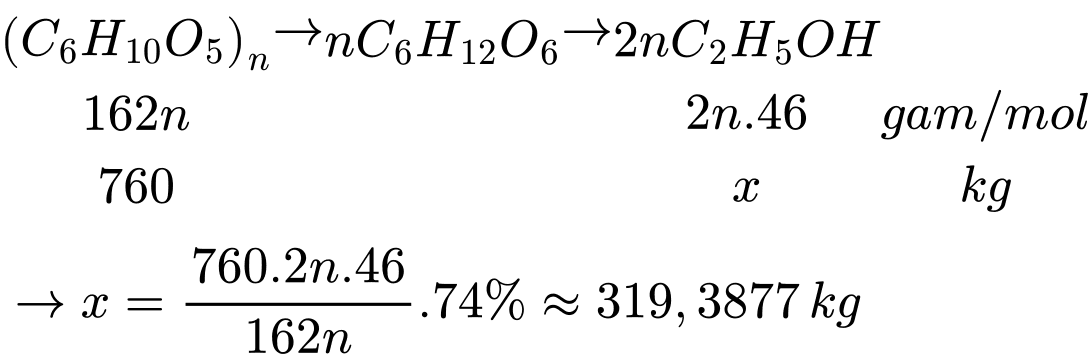 Thể tích alcohol là VC2H5OH = 319,3877:0,8 = 399,2346 L