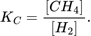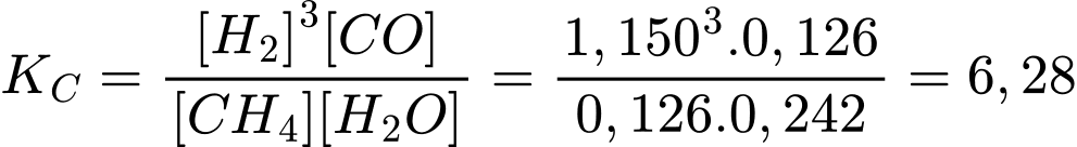 Tính hằng số cân bằng KC của phản ứng trên ở 760 oC. Biết ở nhiệt độ này nồng độ mol của CH4, H2O, H2 và CO ở trạng thái cân bằng lần lượt là 0,126 M; 0,242 M; 1,150 M và 0,126 M.