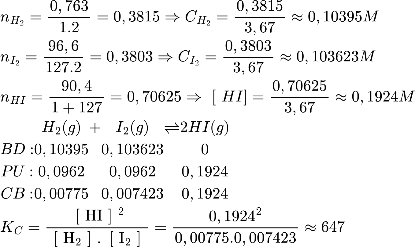 Một hỗn hợp phản ứng chứa trong bình dung tích 3,67 lít ở một nhiệt độ thấp nhất định, ban đầu chứa 0,763 gam H2 và 96,6 gam I2. Ở trạng thái cân bằng, bình chứa 90,4 gam HI. Tính hằng số cân bằng KC. cho phản ứng ở nhiệt độ này (làm tròn kết quả đến hàng đơn vị).