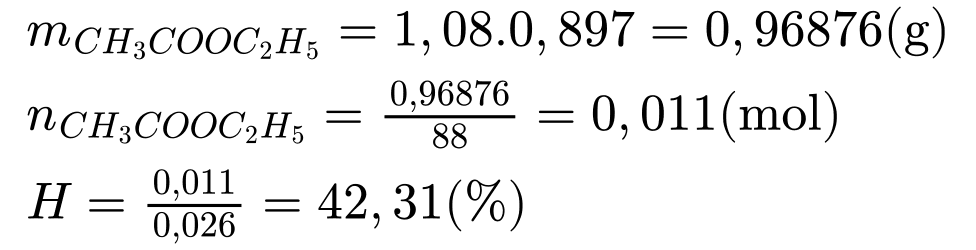 Thể tích ethyl acetate thu được là 1,08 ml. Hiệu suất của phản ứng là bao nhiêu? (làm tròn kết quả đến chữ số phần mười).