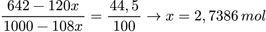 ⇒ Tỉ lệ: (642 – 120a) ÷ (1000 – 108a) = 44,5 ÷ 100 ⇒ a ≈ 2,738 mol.