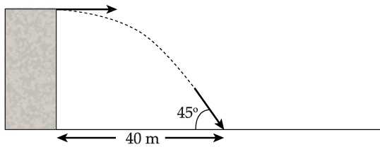 Một quả bóng được ném theo phương ngang từ đỉnh của một tòa nhà. Nó chạm đất tại một điểm cách tòa nhà 40 m, tạo thành một góc 45° với phương ngang như trong hình trên. Chiều cao của tòa nhà là bao nhiêu? Lấy gia tốc do trọng lực g là 10 m/s2.