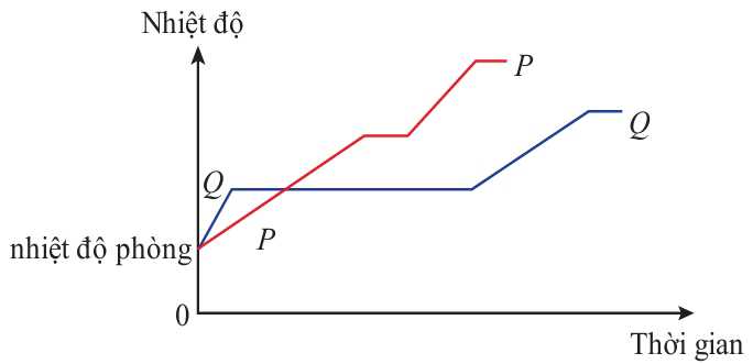 Đồ thị biểu diễn sự thay đổi nhiệt độ của hai chất P và Q cùng khối lượng khi chúng được đun nóng riêng rẽ bởi lò sưởi giống hệt nhau. Suy luận nào sau đây là đúng?