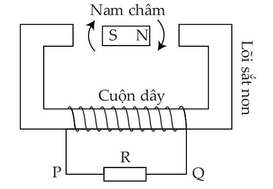 thì từ thông qua ống dây đạt giá trị cực tiểu, trong quá trình trên từ thông qua ống dây giảm dần nên trong ống dây sinh ra dòng điện cảm ứng sao cho từ trường cảm ứng chống lại sự giảm của từ thông nên từ trường cảm ứng có chiều từ phải sang trái, dòng điện cảm ứng có chiều đi qua R từ P đến Q.Tiếp theo khi nam châm quay từ vị trí góc