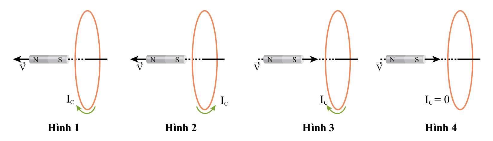 Tại thời điểm ban đầu nam châm nằm ngang, từ thông qua cuộn dây có chiều từ phải sang trái và đang đạt giá trị cực đại.