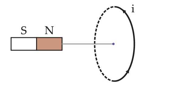 Câu 12 [759788]: Hình vẽ bên dưới mô tả một dòng điện chạy cùng chiều kim đồng hồ trong một vòng dây hình tròn. Vòng dây được đặt gần cực Bắc của một nam châm như hình vẽ.