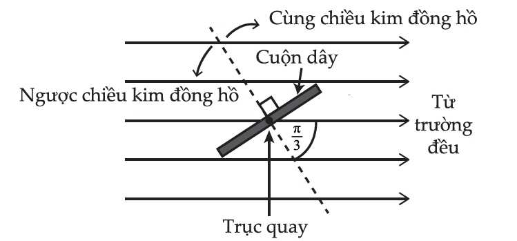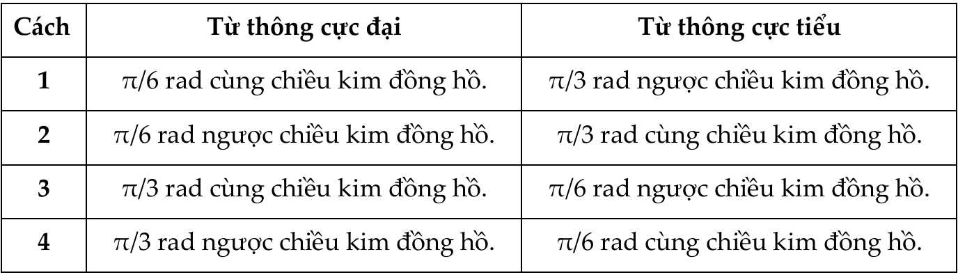 Câu 46 [708818]: Sơ đồ cho thấy một cuộn dây được đặt trong một từ trường đều. Ở vị trí được hiển thị, góc giữa vecto pháp tuyến với mặt phẳng của cuộn dây và vecto cảm ứng từ là π/3 rad. Cách quay nào sau đây mô tả đúng góc quay và chiều quay của cuộn dây để từ thông qua cuộn dây đạt cực đại và cực tiểu
