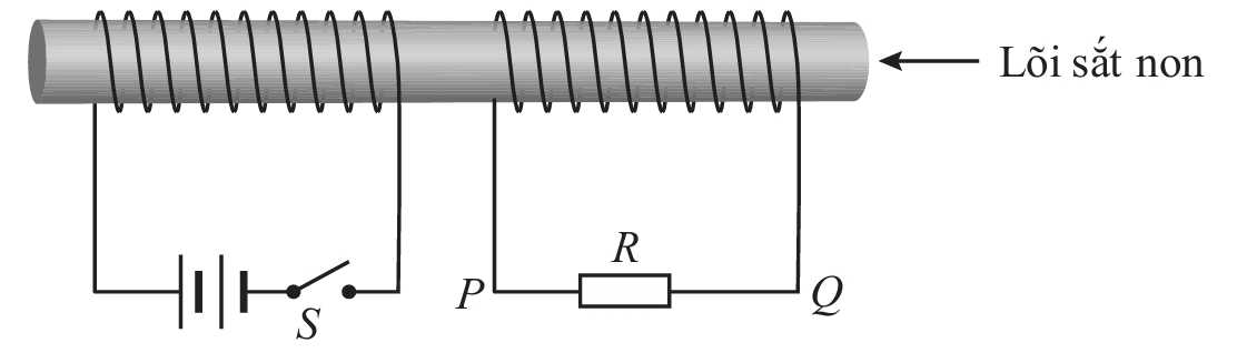 thì từ thông qua ống dây đạt giá trị cực tiểu, trong quá trình trên từ thông qua ống dây giảm dần nên trong ống dây sinh ra dòng điện cảm ứng sao cho từ trường cảm ứng chống lại sự giảm của từ thông nên từ trường cảm ứng có chiều từ phải sang trái, dòng điện cảm ứng có chiều đi qua R từ P đến Q.