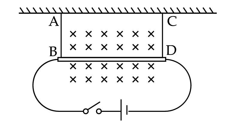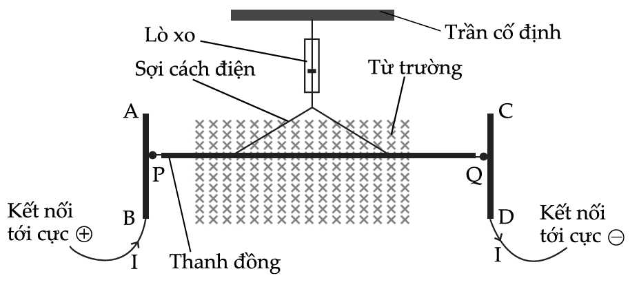 tiếp điểm P và Q ở hai đầu của thanh đồng có thể trượt không ma sát dọc theo hai thanh dẫn điện thẳng đứng cố định AB và CD. Các thanh AB và CD được nối với các cực dương và cực âm của nguồn điện một chiều. Kết quả là, một dòng điện I chạy qua thanh đồng. Giả sử thanh đồng luôn nằm ngang và không rời khỏi từ trường trong suốt quá trình thí nghiệm.