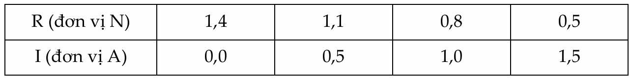 Một giáo viên tiến hành thí nghiệm khảo sát số chỉ R của cân lò xo thay đổi như thế nào theo cường độ dòng điện chạy qua thanh đồng thu được bảng như sau: