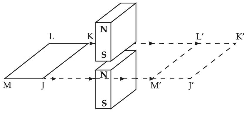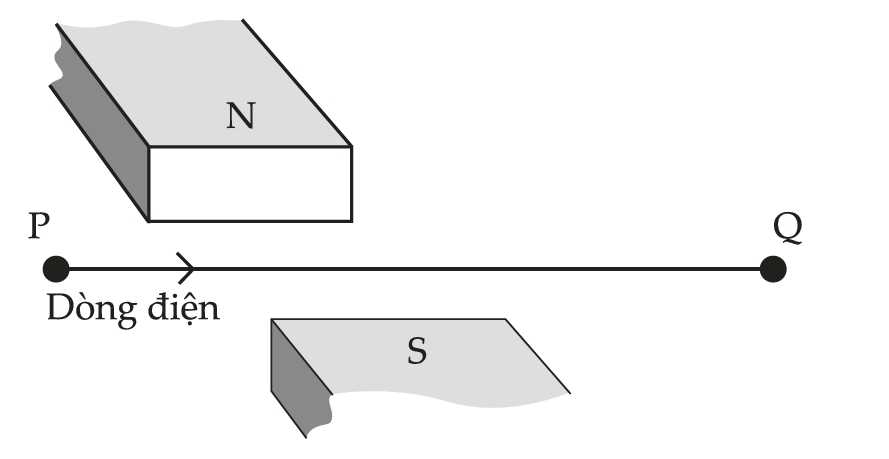 Hình bên cho thấy một sợi dây nằm ngang, được giữ căng giữa các điểm cố định tại P và Q. Một đoạn dây ngắn được đặt giữa các cực của một nam châm vĩnh cửu, tạo ra một từ trường ngang đều vuông góc với sợi dây. Các sợi dây được kết nối với một mạch điện tại P và Q cho phép dòng điện chạy qua sợi dây.