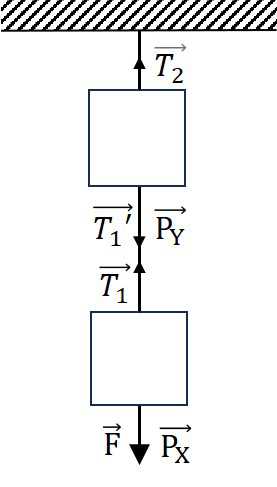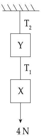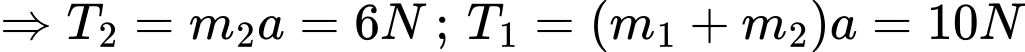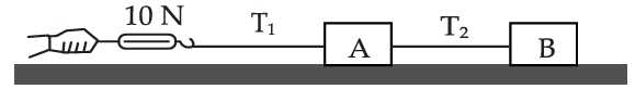 Hai khối A và B có khối lượng lần lượt là 1 kg và 1,5 kg nằm yên trên một mặt phẳng ngang nhẵn và được nối với nhau bằng một sợi dây. Chúng được kéo bởi một lực 10 N như hình vẽ. Các lực căng T1 và T2 là bao nhiêu?
