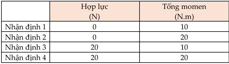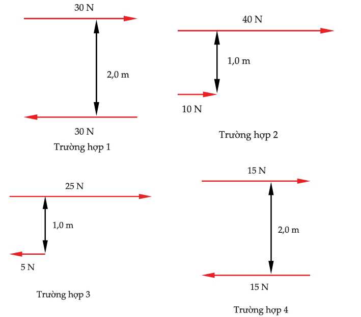 TH4: Hai lực 15N, có độ lớn bằng nhau, ngược chiều, khoảng cách vuông góc giữa hai lực là 2,0m. Momen ngẫu lực là:
