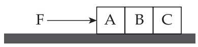 Ba vật có khối lượng bằng nhau được đặt trên một mặt phẳng ngang nhẵn như hình trên. Một lực không đổi F tác dụng vào khối A sao cho ba khối chuyển động về bên phải với cùng một gia tốc. Lực tổng hợp tác dụng vào khối B là