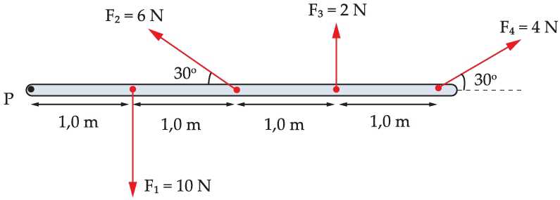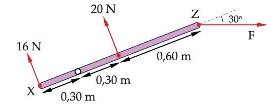 Các lực 16 N và 20 N vuông góc với thanh tại các điểm X và Y, lực F tác dụng vào Z hợp với trục của thanh một góc 30o. Tổng momen của các lực tác dụng lên thanh đối với trục quay đi qua P có độ lớn bằng 6 N.m và cùng chiều kim đồng hồ.