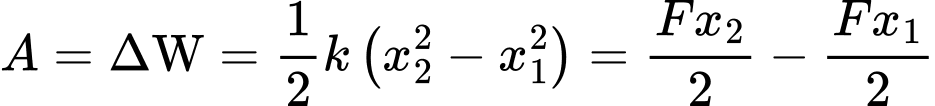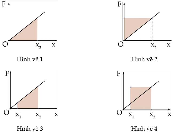 Diện tích vùng tô màu nào dưới đây tương ứng với công của lực F trong dịch chuyển vật từ vị trí lò xo biến dạng một đoạn x1 đến vị trí lò xo biến dạng một đoạn x2.