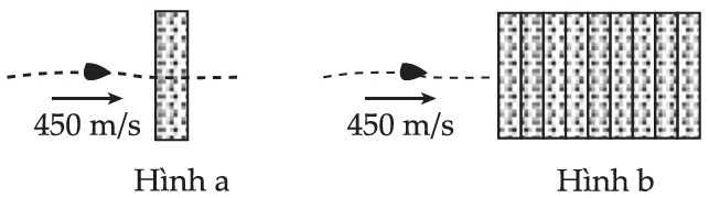 Câu 52 [758041]: Một viên đạn có khối lượng 0,02 kg bay với vận tốc 450 m/s xuyên qua một khối gỗ như trong Hình (a) và rời khỏi khối gỗ với vận tốc 400 m/s. Trong hình (b), số khối giống hệt nhau tối đa mà cùng một viên đạn có thể xuyên qua là bao nhiêu? Coi lực cản mà các tấm gỗ tác dụng lên viên đạn là như nhau